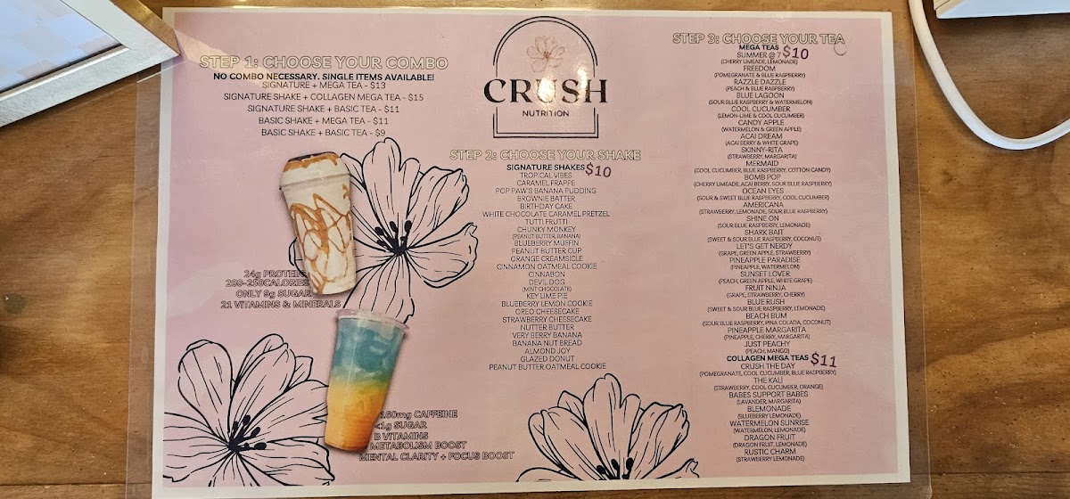 Introducing CRUSH nutriton, a vibrant cafe nestled in Jacksonville, NC, where health meets indulgence. With an eclectic menu that showcases both Signature Shakes and Teas, CRUSH nutriton offers an array of flavors designed to delight and energize. The Signature Shakes, priced at $9, feature enticing choices like Caramel Frappe and Birthday Cake, while Basic Shakes present satisfying options for just $6. Their High Protein Iced Coffees, available for $4, promise a rich, flavorful boost. Notably, customer experiences highlight the warm, welcoming atmosphere and knowledgeable staff who guide you through their offerings.